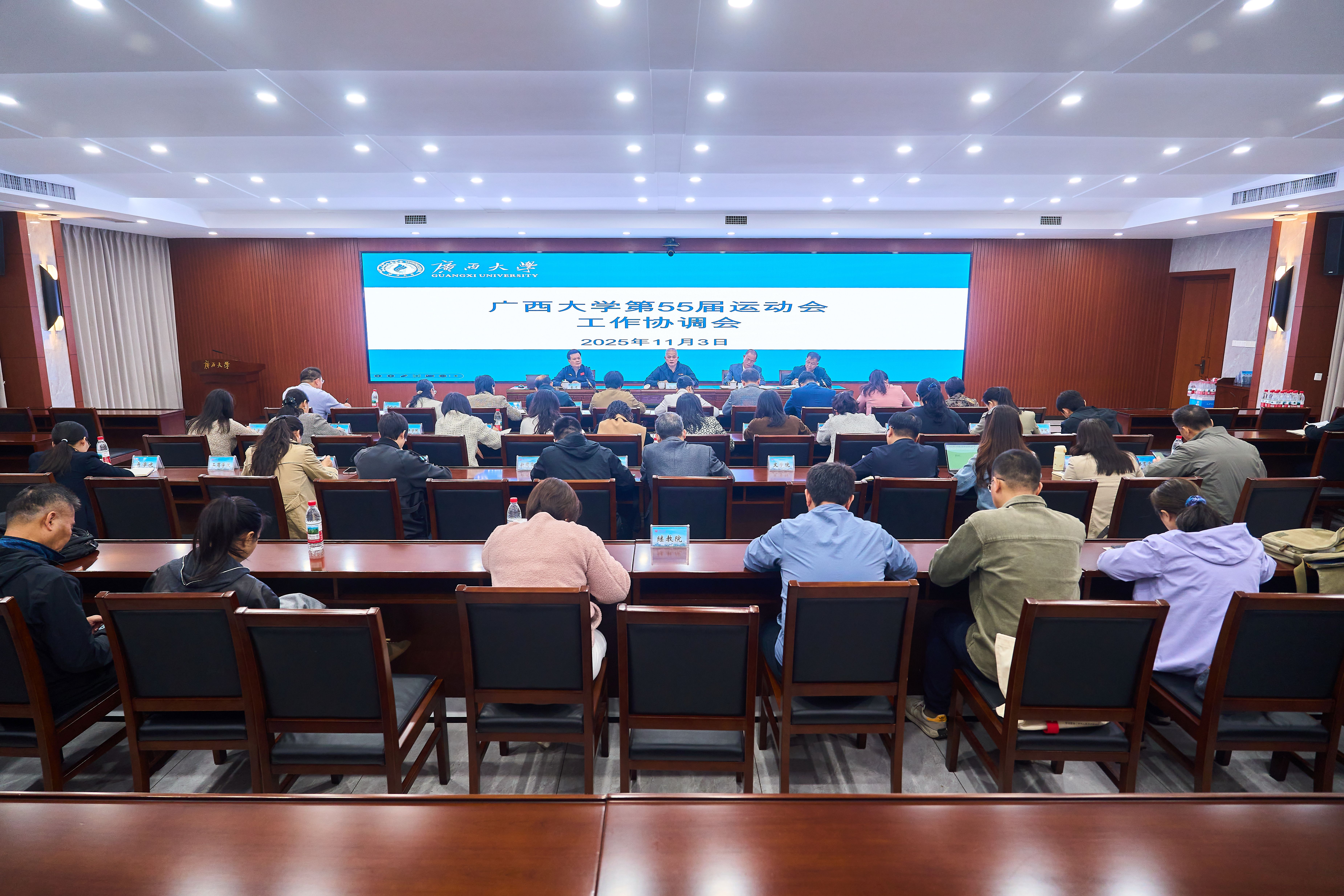 2025年11月3日,广西大学第55届运动会工作协调会在君武馆第二会议室举行,体育学院党委书记覃安基主持会议,校党委常委、副校长、校体委主任刘向出席会议并讲话。