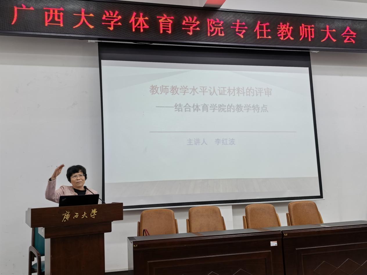 为进一步规范教师教学水平认证材料准备工作,提升学院教学质量与教师专业素养,3月17日,体育学院在网球中心举办教师教学水平认证材料评审专题讲座。本次讲座由学院巡课督导李红波教授主讲,全院相关教师参会聆听,共同学习认证材料评审要点。
