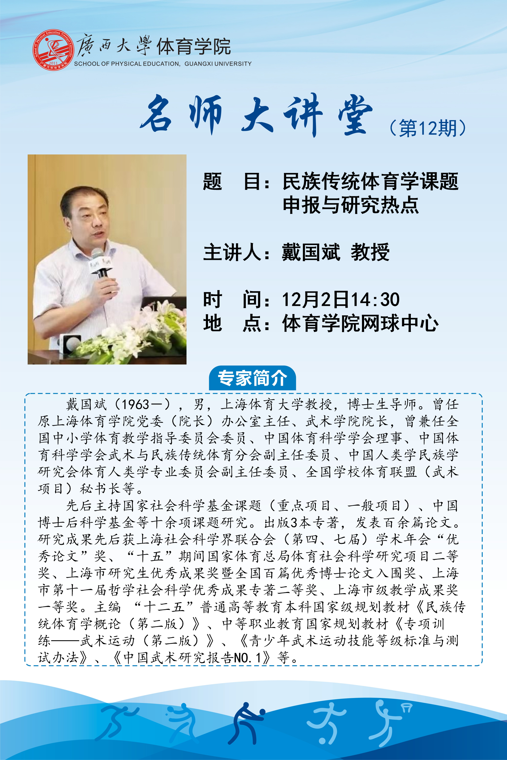 体育学院名师大讲堂(第12期):民族传统体育学课题申报与研究热点